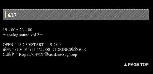 6月17日(木) だいちゅーPresents 〜analog sound vol.2〜 大阪・南堀江CELL BLOCK http://www.cell-block.net/ 〒550-0015大阪市西区南堀江2-13-26 OPEN:18:30/START:19:00 前売:\1,800/当日:\2,000(1DRINK別途\500) 出演者:Rojika/小南泰葉/ashLee/Sug'loop CELL BLOCK オフィシャルサイト http://www.cell-block.net/ だいちゅーさんブログより情報引用 http://ameblo.jp/daichu-drum/entry-10555137200.html ※詳細は、小南泰葉オフィシャルサイトでご確認ください。 http://kominamiyasuha.com/ http:
