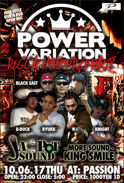 6/17(THU) @PASSION ☆POWER VARIATION☆ ○HIPHOP SIDE *D-DUCK *EAST BLACK(ZEEK,NIT,SMOKE,) *RYUKK ○REGGAE SIDE *KNIGHT *音人 ○SOUND JACK POT SOUND(from岡山) OPEN:23:00 CLOSE:05:00 1000YEN/1D RUB-A-DUB OPENMIC!!!! ゲストありなんで来てくれる人メッセージでも下さい