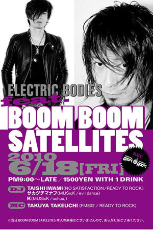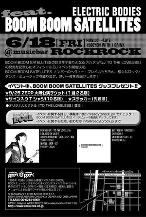 失礼いたします。 大阪のクラブイベント × ウェブ情報サイト、「READY TO ROCK」と申します。 この度、BOOM BOOM SATELLITESの7THアルバム「TO THE LOVELESS」の 発売を記念した、オフィシャル・DJイベントを開催いたします。 -------------------------------------------------------- 2010年5月26日に発売となるBOOM BOOM SATELLITESの約2年半振りとなる 7thアルバム「TO THE LOVELESS」の発売を記念したオフィシャルDJイベント。 BOOM BOOM SATELLITESナンバーのへヴィー・プレイはもちろん、 様々なロック/ダンス・ミュージックを、オ