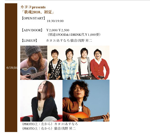 ■2010年6月18日(金) @アメリカ村 Soap Opera Classics http://www.toms-soc.jp/ 大阪市中央区西心斎橋1-6-8 トムズハウス4F 最寄り駅 地下鉄心斎橋駅 徒歩3分 カヨコ presents... 『唄魂2010、初夏』 〜アコースティック・ナイト〜 唄魂シリーズ第3弾、開催決定致しました! 出演…浅野昇二、あすなろ、猫音、カヨコ 前売2000円+F&D 当日2500円+F&D 開場18:30、開演19:00 カヨコ3度目の主催ライヴ、とても気合いの入ったイベント内容になっております お時間ありましたら是非、お越しくださいませ。