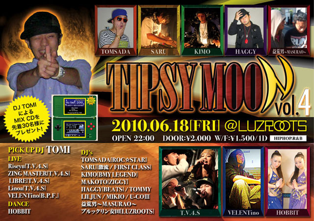 LUZROOTSがお贈りするPREMIUM PARTY『TIPSY MOON』!良質な空間を作り出す輩達が 新旧問わないPARTY TUNEで、皆様を至福な一時に誘いま す。今回はDJ TOMIによるMIX CDを先着30名様にプレゼント!これからの季節、ドライブなどにぴったりの選曲となっています。是非この機会にGETしてみて下さい。『TIPSY MOON』…音楽とお酒、この雰囲気に酔いしれてみては…!! 2010.06.18(Fri) OPEN 22:00 GENRE : HIPHOP / R&B ■PICK UP DJ TOMI ■LIVE Riseyu(T.V.4.S) /ZING MASTER(T.V.4.S) / LIBRE(T.V.4.S) / Linoa(T.V.4.S) / VELENTino(B.P