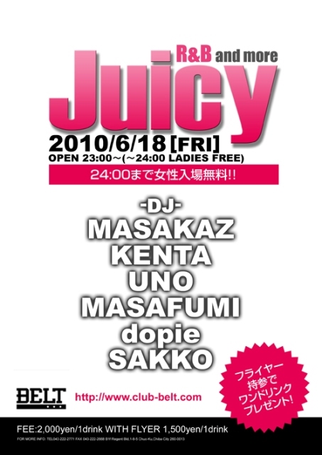 色々なCLUBで頻繁にかかるR&B。 しかしながら、「かかるR&Bの曲が毎回同じでつまらない!!R&Bがもっと聞きたい!!」 そういった方々に向けて、BELTではR&BやNew Jack Swing、Soulなど、 上質な歌ものが流れるイベント『JUICY』が6月18日に開催されます!! しかも24時まで、なんと女性は無料!!! R&B、New Jack Swing、Soulなどが好きな方は是非足を運んでみて下さい!! 6/18(金) R&B,and more... 『JUICY』 OPEN 23:00- DJ: ■MASAKAZ ■KENTA ■UNO ■MASAFUMI ■dopie