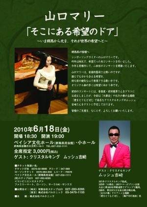 山口マリー・プロデューサーの池田和一郎です。 このたび、群馬県前橋市出身シンガーソングライター山口マリーの、 ご支援をいただきたくお願い申し上げます。 山口マリーは、18歳より東京で音楽活動を始め、現在ではオリジナル50曲ほどの力量を持つにいたりました。ご存じのように現在の音楽業界は低迷を続けており、なかなか新人の活躍できるシーンはありません。その苦境の中でも山口マリーは希望のドアを拓くためにCDを作成し、ネットでのダウンロード活動を継続しております。 昨年6月に一回目の前橋コンサートを、音楽家の前田憲男先生