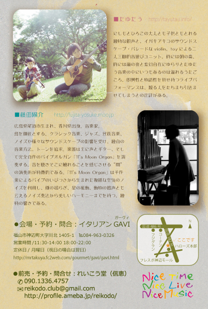 2010/6/18(金) 会場:イタリアンGAVI (福山市神辺町川北1405-1) open 19:00 start 20:00 前売り2500円(1d) 当日3000円(1d) 出演: たゆたう 藤田陽介 問い予約、 イタリアンGAVI 084-963-0326 http://mrtakuya.fc2web.com/goumet/gavi.html れいこう堂 09013364757 reikodo.club@gmail.com 詳しくはhttp://profile.ameba.jp/reikodo/ を