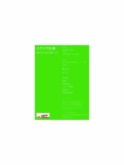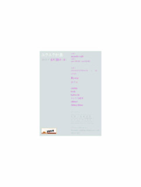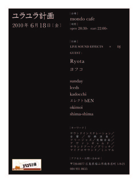告知失礼致します。 金曜日のヨルに、どっぷり深くユラユラしませんか? ■□■■■ユラユラ計画■■■□■ 2010.6.18 (金) ■会場 : mondo cafe ■時間 : open 20:30 - start 22:00 - ■入場料 : No charge ■計画 : live sound effects × DJ guest : Ryota ヨフコ sunday leeds kadocchi エレクトbEN okimoi shima-shima and more..... ---------------------------------------------------------------------- サウンドインスタレーション/音響/ 即興演