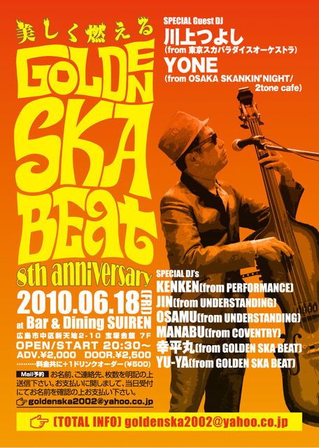 皆様お待たせ致しました! 毎年GW 5/5に開催してましたスカビート!今年はGWを外してのイベントが決定しました! 今年のスカビートは豪華なゲストDJさんを迎えてのDJイベントです。 なんと、チケットは限定200名様のみ! この機会を逃すな!! 今年もやって来た!! 泣く子も踊る中四国最大のSKAイベントGOLDEN SKA BEAT! 今回お届けする気になるイベントの内容とは、スペシャルゲストDJに日本、いや世界が誇る大御所バンド、東京スカパラダイスオーケストラから川上つよし氏、大阪から、今年で14年目に突入した浪花のSKAパーテ