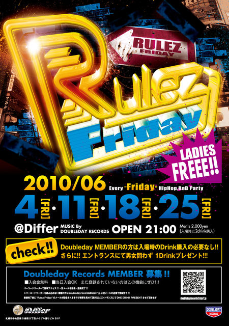 【毎週金曜日のHIP HOP/R&B PARTY】 " Rulez Friday "!!!!! HIP HOP/R&Bの最新HIT TUNEはもちろん! 90's Classics、誰もが知ってるアノ曲まで! Music by... 【DOUBLEDAY RECORDS】!!! HIP HOP、R&B好きにはMUSTなPARTY!!! そしてなんと! このPARTYではDOUBLEDAY MEMBERの方に1DRINKプレゼント! 入会金無料!当日入会OK! まだ登録されていない方はこの機会にぜひ! 毎週金曜日はDifferで" Rulez Friday "!!!!! 皆様のお越しをお待ちしております! >>6.4.FRI. >>6.11.FRI >>6.18.FRI. >>6