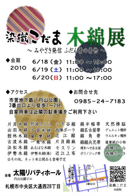 木綿着物、北へ。 2010年6月の染織こだまは北海道札幌市で「木綿展」を開催。 未踏の地すぎてあれやこれやと心配もありますが、気合で。 商品の季節やジャンルは限定せず、ウールや冬向けのものも 含め染織こだまの「ふだん着着物まわり」持って行きます! 木綿・綿麻・麻・ウール等はもちろん、帯・襦袢・小物等も 精一杯お届けしますので、この機会にどうぞお運びいただけ ますようお願い申し上げます。 男性女性、カップル、子どもさんの着物ご提案いたします。 着物に限らず、道中着・羽織・コート・袴もオーダーできます☆