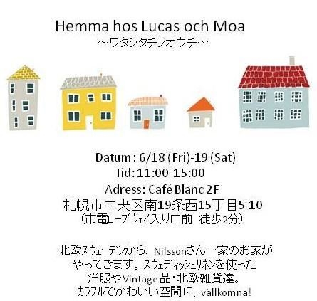 イベントブログ http://hemmahoslm.exblog.jp/ 6月18(金)-19日(土)、札幌のステキなカフェ、「Cafe blancさん」にて、 PomtyとLyckaの2人でイベントを開催します。 私達にとって、始めてのことでイロイロ不慣れな事がたくさんですが、 たくさんの人に楽しんでもらえたらと思っています。 スウェーデンの雑貨、ビンテージ品、フリマやスーパー等で買ったもの、 スウェーデンリネンを使ったハンドメイド品・洋服などが並びます。お近くの方は、ぜひ足を運んでくださると、ウレシイです。 まだまだ未熟な私達ですが、コレを機会に私の