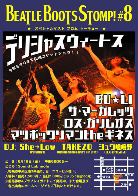 ■6/18(金) "Beatle Boots Stomp! #8" @Sound Lab mole (札幌市中央区南3西2/狸小路2丁目 ニコービルB1F) 開場/開演 18:30 前売1,500円 / 当日2,000円 (1ドリンク別途500円) 前売券取扱い : 4プラプレイガイド ※まだ取り扱っておりません。開始次第お知らせします。 出演 : デリシャスウィートス(東京) マツボックリマンTheギネス ロス・ガリレオス THE MARGARETTES BU☆LI DJ : She→Low (POISONIVY, 千歳) TAKEZO (Gimme Some Lovin'!, HIP CITY) シュウ嵯峨野(ロス・ガリレオス) ※1年前の"Be