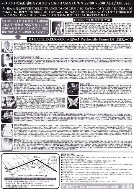 6月19日(土) 横浜BAYSIDE 史上初exclamation ×2 デカ箱初exclamation ×2 DJ バトル るんるん 人気ナンバーワン決定戦るんるん 料金 ALL 3000円 22時〜5時 22〜23時はオープニングDJ ★REI★(A&G/Jp) バトル開始は23時〜です バトルするDJ 10名 ★KATO★ (BIOSPHERE/K-HOLE/jp) ★SAKURA★ (A&G/ALICE/jp) ★団長★ (跳乱州一家/K-HOLE/夢幻/jp) ★YAGI★ (N.P.D.SOUND CREW/ENIGMATIC SOUND/ADS/REBEL/jp) ★YANAZI★ (rapture-sounds/BUTTERFLY-RECORD/ELEC-TION/jp) ★NAO★ (TRANCE RAVE/j