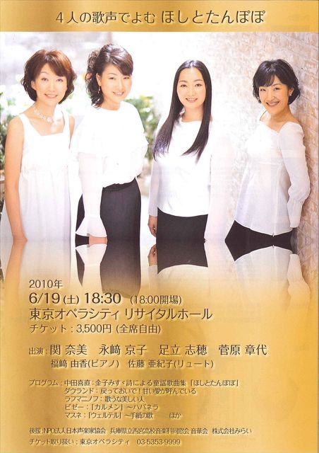 ご無沙汰しております。 shihoです。 6月に大学の同級生と4人でコンサートをすることになりました。 昨年の練馬メサイアを聴きに来てくれた3人が、 演奏会後、ご飯を食べながら盛り上がってグッド(上向き矢印) 4人でコンサートをやろうexclamationということに、なったようです。。。 それはそれで、起爆剤になれたことを嬉しく思いますうれしい顔 日時:2010年6月19日(土) 開演18:30 開場18:00 場所:東京オペラシティ リサイタルホール(京王新線・初台駅) チケット:3500円 → 3000円揺れるハート 全席自由 前半と後半は全く違う世界になる