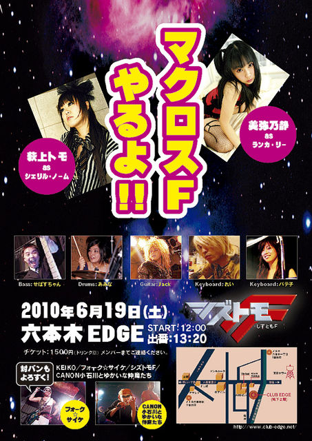 ライヴの告知をさせて下さいませ。 マクロスFのコピーバンド,「シズトモF」のギャラクシーツアー・イン・六本木が決定しました電球 歌うのは彼女らです↓ ハートトモ(as シェリル・ノーム)ハート http://ogiuetomo.com/ ハートシズ(as ランカ・リー)ハート http://www.miyanosizu.jp/ 日付:2010年6月19日(土) 出演:CANON小石川とゆかいな仲魔たち,シズトモF,フォーク☆サイケ,KEIKO 場所:club Edge 六本木 http://www.club-edge.net/index.html 開場:11:50 開演:12:00 チケット代:1500円(ドリンク代500円別途必