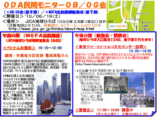 第9回のOB/OG会を6月19日(土)10時から行ないます。 午前の部は広尾のJICA地球ひろば会議室で、外務省大臣官房の鷺坂様にベトナムの現状をお話いただきます。駐ベトナム日本大使館から帰任直後とのことで、最新事情をお聞きできると思います。  JICA地球ひろば:http://www.jica.go.jp/hiroba/about/map.html 午後はJICA地球ひろばを13時40分に出発して、代々木上原にある東京ジャーミイ・トルコ文化センターで国内有数のモスクを見学します。  http://www.tokyokamii.org/ モスク見学に際しては、次の点にご注意ください
