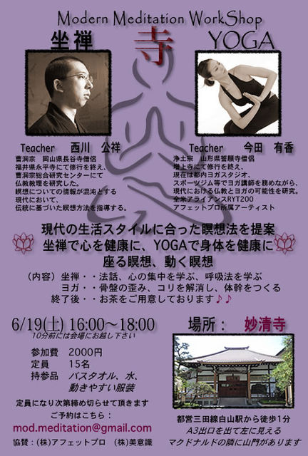 大変長らくお待たせ致しました!! 「第3回モダンメディテーション[お坊さんによるヨガと坐禅のコラボレーション]ワークショップ   開催決定しましたのでお知らせします!! 伝統ある仏教僧侶が、現代の生活スタイルに合った瞑想を提案します。 ヨガで体を健康に、坐禅でこころを健康に。 動く瞑想としてゆったりとしたヨガ、座る瞑想として坐禅が体験出来ます。 1、ヨガ 40分 (指導【ヨガインストラクター、浄土宗僧侶】)   【骨盤のゆがみを矯正 体のコリ緊張をほぐす 体幹をつくる】 2、坐禅 40分 (指導 【曹洞宗