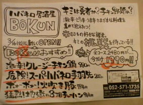 カプサイシン とってますか! 夏バテ防止にいい汗かこうぜ。 というわけでコミュ借ります!>w< イベントというほどのイベントではありませぬが ちょっくら激辛な飲み屋に行こうぜ〜的なものでございます。 「ハバネロ居酒屋BOKUN」 ●開催日/6月19日(土) ●集合場所 9時ぐらいに ユニモール12番出口 片付けなどがあるので 店入りは9時10分ごろにしてくれということです。 10名で予約しますた。 一応頼んだものは完食してく方向デ! 食べるのを強制はしないので無理はするなよ?^−^ 料金は基本的
