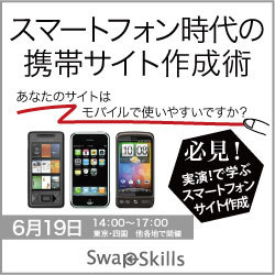 SwapSkills 2010年(Vol.4)は、スマートフォン時代を迎える今だからこその携帯電話サイト制作についてを、IMJモバイル(http://www.imjmobile.co.jp/)の丸居久仁男さんと森啓介さんから講演をいただきます。 iPhone、iPad、XPeria、Palm とこれから、世界中から日本にとめどなく押し寄せてくるスマートフォンに対して、携帯電話のウェブ制作はどうなってるのか?を講演をいただきます。 また、iPhone と iPad のウェブサイトの制作方法はどうしたらいいのか?も講演をおこないます。 ■日時■ 2010年06月19日(土)14:00 - 17:00 ■講