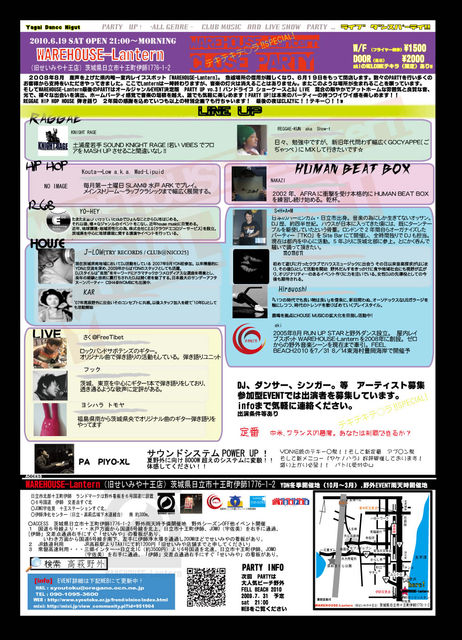 FINAL!! WAREHOUSE-Lantern CLOSE PARTY -PARTY UP VOL.3- 2年間有り難うございました! テキテキテ○ラ!!SPECIAL! 2010.6.19 SAT 21:00〜 @WAREHOUSE-Lantern(旧せいみや十王店) 茨城県日立市十王町伊師1776-1-2 W/F (フライヤー持参)\1500 DOOR(当日) \2000 主催よりWELCOMEテ○ラ!!ありw 2008年8月 産声を上げた県内唯一室内レイブスポット「WAREHOUSE-Lantern]。 急遽場所の借用が難しくなり、6月19日をもって閉店します。数々のPARTYを行い多くのお客様から支持をいただきやってきました。ここでLanternは