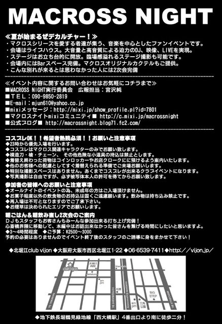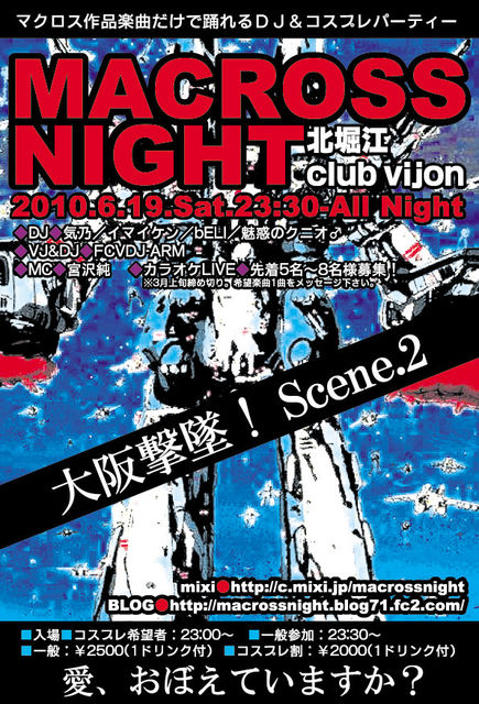 マクロス作品と音楽をこよなく愛してやまない人へ贈る、 マクロスシリーズの全てを網羅した作品音楽の祭典が関西に再来! 昨年から東京で始まったマクロスナイトですが、 待望の第2回開催が決定しました。 もちろん各地からの遠征さんも大歓迎! そして今回はなんと!大阪マクロスオフ会との連動企画となりました! ●●第3回マクロスFオフ会@大阪●● http://mixi.jp/view_event.pl?id=52672302&comm_id=1889321 お時間ある方は昼間はオフ会、夜はマクロスナイトと、 マクロス尽くしの1日をお楽しみくださいね☆ ☆☆☆☆