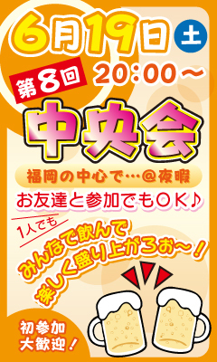 あの夜会が再び開かれる! …ジャン(・∀・)♪ 第8回中央会のお知らせです! *詳細********* 6月19日(土) 20:00 start(^3^)/ 場所は… 博多駅筑紫口よりすぐの和民です! 集合は… 19:45までに 博多駅筑紫口赤ポスト前にお願いします(^∀^)> 参加費は…、 飲食代をみんなで割ります (いつもは¥2,000―くらい) 定員は、 いまのところ特に設けてはいません。 が、ある程度人が集まってからお店に予約しますので 席の都合上締め切らせていただく場