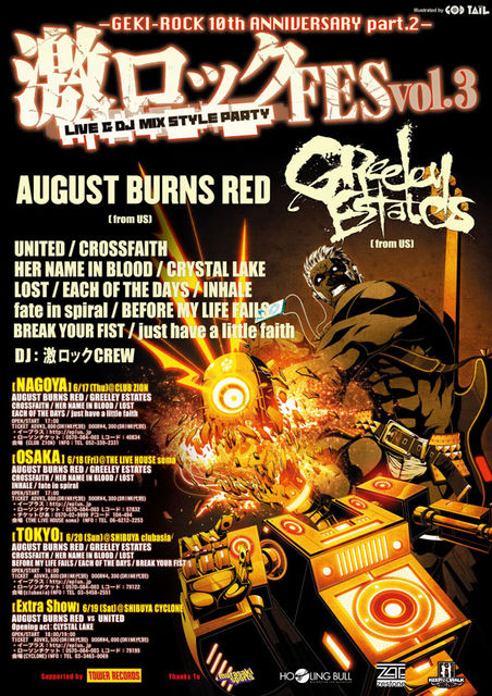 AUGUST BURNS RED、GREELEY ESTATESを、UNITED、CROSSFAITH 、HER NAME IN BLOOD、LOST、EACH OF THE DAYSといった国内のメタル/ハードコア・シーンを牽引するバンドたちが迎え撃つ!!
