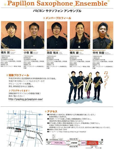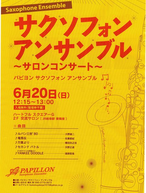 ************************************************* サクソフォン アンサンブル 〜サロンコンサート〜 出演:パピヨン サクソフォン アンサンブル 日時:2010年6月20日(日)12:15〜13:00 場所:ハートフル スクエアーG(JR岐阜駅 東隣接) 2F 交流サロン 入場:無料(整理券不要) 曲目: ♪ルパン三世’80 大野雄二 作曲 ♪竜馬伝 佐藤直紀 作曲 ♪万葉より 櫛田てつ之扶 作曲 ♪セカンド バトル 天野正道 作曲 ♪YANKEE DOODLE 渡部哲哉 編曲