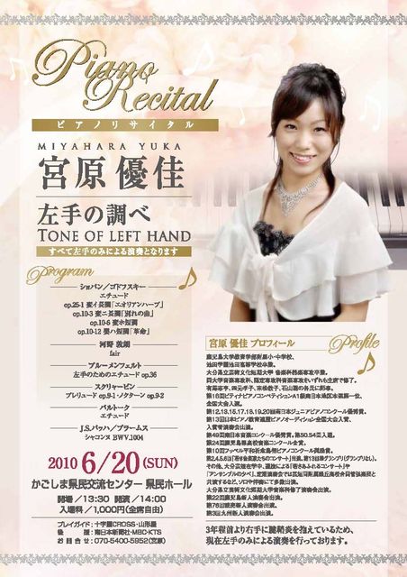 みなさまこんにちは。附属中49期生の田村と申します。 ショパンイヤーで盛り上がっている昨今、皆様いかがお過ごしでしょうか? 本校卒業生によるピアノリサイタルの告知をさせて下さい 一ヶ月後の6月20日、県民交流センター/県民ホールに於いて ピアニスト宮原優佳さんによる初のピアノリサイタルが行われます。 附中在籍時に既に全国の大きなコンクール等で受賞を重ねてきた彼女ですが、 現在は右手の腱鞘炎のため左手のみでの演奏活動を行っております。 左手のみによるピアノ曲は未だ一般的とは言えませんが、 曲そのもの