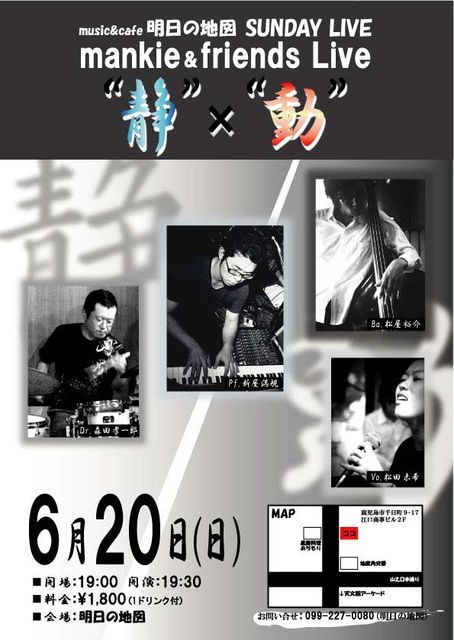 2010年6月20日(日) <<SUNDAY Mankie(Piano)&Friends JAZZ & POPS LIVE!!!!>> 時間;PM7:30〜 料金;1800円(ワンドリンク付) 会場;カフェ 明日の地図(099−227−0080) ☆☆☆PERFORMERS☆☆☆ PIANO;新屋 満規 http://mixi.jp/show_friend.pl?id=10592522 ピアノ演奏・作曲・ピアノ教室・音響・イベントコーディネイターとして活躍中。2009年度より「明日の地図SUNDAY レギュラー」に参加。様々なボーカリストより信頼されているピアニストでもある。
