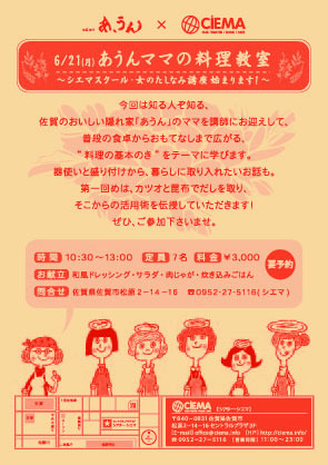 6/21(月) あうんママの料理教室 シエマスクール女のたしなみ講座始まります! 今回は知る人ぞ知る佐賀のおいしい隠れ家「あ うん」のママを講師にお迎えして、 普段の食卓からおもてなしまで広がる、“料理の基本のき”をテーマに学びます。 器使いと盛り付けまで、暮らしに取り入れたいお話も。 第1回目は、カツオと昆布でだしを取り、 そこからの活用術を伝授していただきます! ぜひ、ご参加下さいませ。 ■ 時間10:30〜13:00 ■ 定員7名 ■ ¥3000 ■ お献立 (和風ドレッシング・サラダ・肉じゃが・炊き込みご