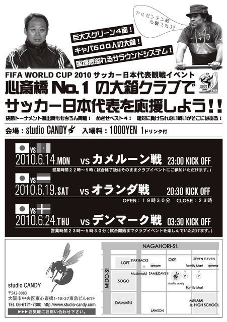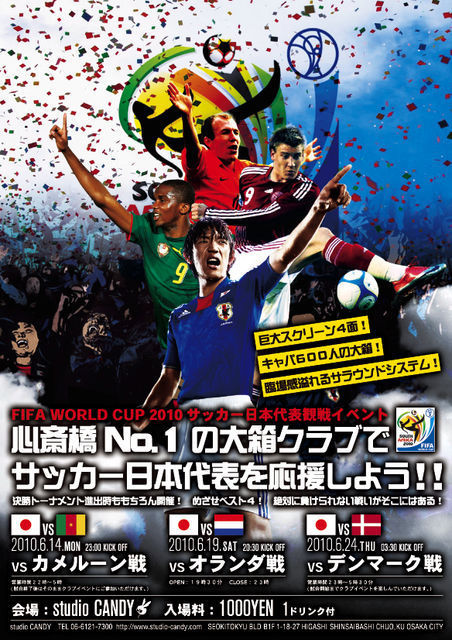 皆さん 遂に4年に一度の祭典 FIFA WORLD CUP 2010 @ 南アフリカが開催 今回は、日本にいながら臨場感たっぷりで観戦できる特大イベントを行いますよ 皆さんで日本代表を応援しませんか?? 特典は・・ ◆複数の超大型4面スクリーンで観戦 ◆約600人収容の大箱会場 ◆現場で観戦さながらの臨場感のあるサウンドシステム 【会場】 STUDIO CANDY ホームページ↓ http://www.studio-candy.com/ 大阪市中央区東心斎橋1-18-27 東急ビルB1F TEL:06-6121-7300
