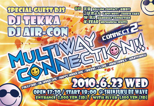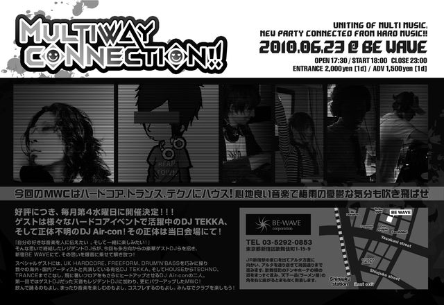 今回の“MULTIWAY CONNECTION”はハードコア、トランス、テクノにハウス! 心地良い音楽で梅雨の憂鬱な気分も吹き飛ばせ!! 『自分の好きな音楽を人に伝えたい 。そして一緒に楽しみたい!』 そんな思いで集結したレジデントDJらが、今回も多方向からの豪華ゲストDJらを招き、 新宿BE WAVEにて、その思いを爆音に乗せて解き放つ! スペシャルゲストには、UK HARDCORE、FREEFORM、DRUM'N'BASSを巧みに操り 数々の海外・国内アーティストと共演している有名DJ TEKKA。そしてHOUSEからTECHNO、 TRANCEまでこなし、既に暑いフロアをもさらにヒ