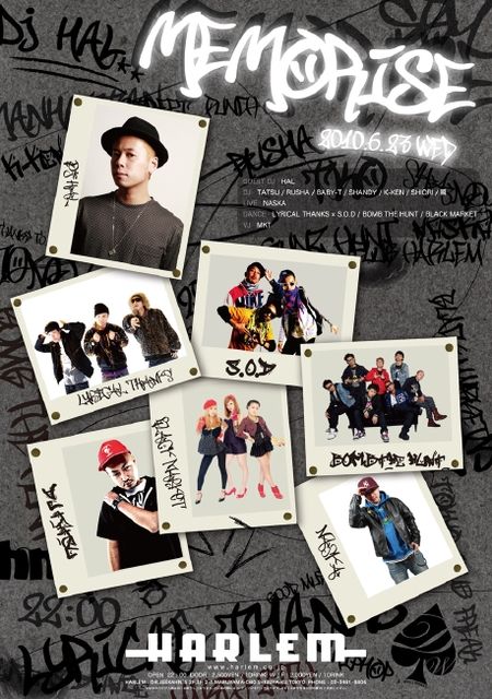 今夜!!!6/23(水)渋谷@HARLEM【MEMORIZE】豪華!!前回大好評!噂のピースフルPARTY♪DJ HAL出演☆ディスカウント受付中♪ OPEN-22:00 ゲスト料金¥1500/1d 自分にメッセージ頂ければ通常¥3000の所、¥1500/1dのゲスト料金でご入場頂けます 前回本当に大好評だったスペシャルイベント〈Memorize〉がPOWER UPして再登場 GUEST DJには誕生日直後の説明不要のDJ, DJ HALを迎え、 DANCE SHOWCASEには大人気、渋谷を中心に活動中の LYRICAL THANKS/S.O.D./BOMB BOMB/Gunz HUNTがユニットで登場 LIVEには渋