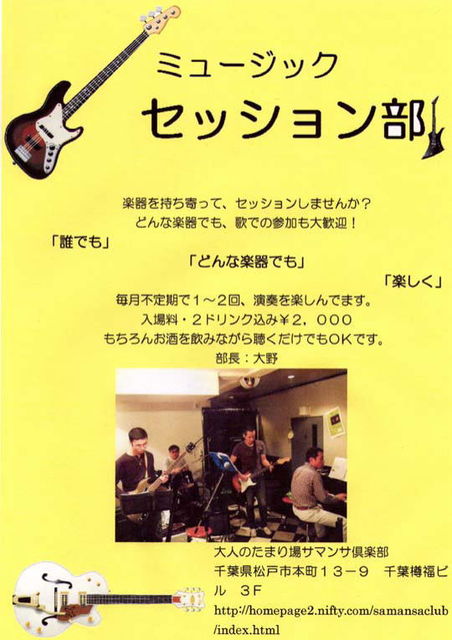 「誰でも、どんな楽器でも、楽しく」がモットーのセッション部です。 楽器を持ち寄って、セッションしませんか? どんな楽器でも、歌での参加も大歓迎! 初心者も大丈夫、楽しくセッションしましょう! 2010年6月23日(水)19:30〜22:30 入場料・2ドリンク込み¥2,000 もちろんお酒を飲みながら聴くだけでもOKです。 知ってました? 数えなおしたら去年から始まったセッション部は20回目を迎えました。 セッション部初のイベントを計画してます。 http://mixi.jp/view_event.pl?id=53719432&comment_count=7&c
