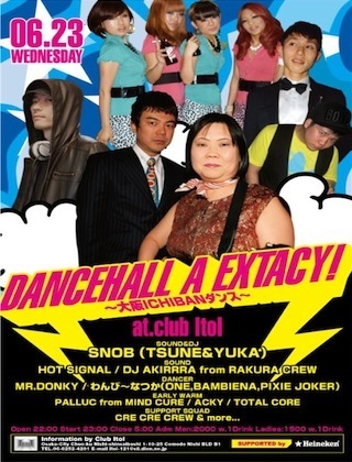 ※毎月一度の時差なしJAMAICA! でアメ村REGGAE好きにおなじみのエクスタシー! がなんと老舗大箱I TO Iに大移動!CHANGE VENUE! しかも!強烈にパワーUPしてよりグレードUP!してのリニュー アル! 大阪でもっともエンターテイメントなSOUND "SNOB" がお送り する のはとにかく,楽しめて!踊れて!みんなが,主役! 時に,はっちゃけ!時に.揺れ!時に.心ふるわせ! そんな”人と人がつながる”ダンスホールの現場! 日本とJAMAICAをまたにかける”SNOB”とともに 滋賀のKING OF DANCEHALLこと"HOT SIGNAL"と らく