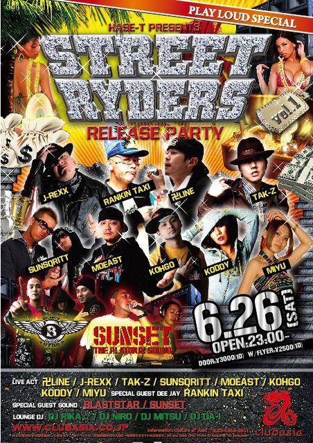 日本を代表するレゲエプロデューサーHASE-Tとジャパニーズレゲエ最前線で活躍する豪華アーティスト勢がタッグを組んだ激ヤバチューンとスペシャルREMIXチューン満載のレゲエアルバム”STREET RYDERS vol.1"のリリースパーティーがPLAY LOUD スペシャルとして開催決定!!J-REXXX,MOEAST,KOHGO,KODDY,MIYU,に加え、関西エリアからTAK-Z,関越エリアからSUNSQRITTといった次世代を担うアーティストが全国から集結!!そして日本のレゲエシーンのパイオニアであり、今も尚、C.C.P.P等