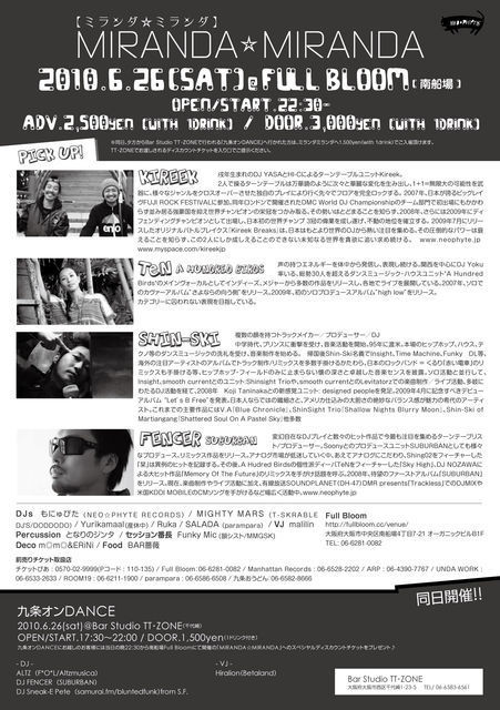 九条オンDANCEにお越しのお客様には当日の晩22:30から南船場Full Bloomにて開催の「MIRANDA☆MIRANDA」へのスペシヤルディスカウントチケットをプレゼント♪