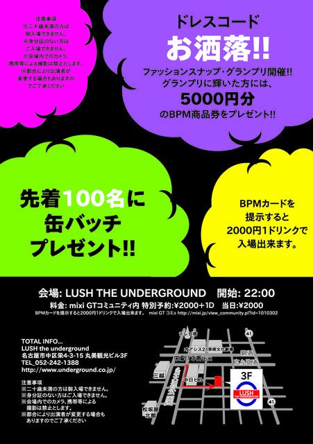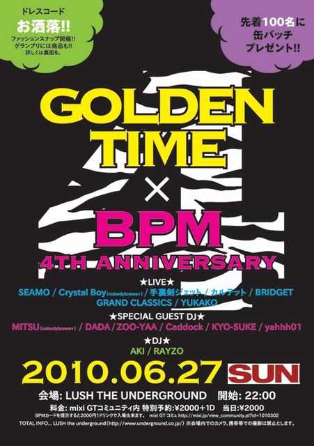 ¡ù BPM 4TH ANNIVERSARY ¡ß GOLDEN TIME ¡ù ÆüÉÕ¡§2010.06.27.SUN ¾ì½ê¡§LUSH THE UNDERGROUND ³«»Ï¡§22:00¡ÁMID ÎÁ¶â¡§ADV2000±ß+1DRINK¡¡DAY2000±ß (BPM¥«¡¼¥É¤òÄ󼨤¹¤ë¤ÈÁ°Çä¤ê¤Î2000±ß1DRINK¤ÇÆþ¾ì¤Ç¤¤Þ¤¹) DRESS CODE¡§¤ªÞ¯Íî!! ¥Õ¥¡¥Ã¥·¥ç¥ó¥¹¥Ê¥Ã¥×¡¦¥°¥é¥ó¥×¥ê³«ºÅ!! ¥°¥é¥ó¥×¥ê¤Ëµ±¤¤¤¿Êý¤Ë¤Ï5000±ßʬ¤ÎBPM¾¦ÉÊ·ô¤ò¥×¥ì¥¼¥ó¥È!! ÀèÃå100̾¤ËBPM4¼þǯ¤¢¤ê¤¬¤È¤¦´Ì¥Ð¥Ã¥Á¤ò¥×¥ì¥¼¥ó¥È!! ¢¨Æó½½ºÐ̤Ëþ¤ÎÊý¤Ï¸æÆþ¾ì¤Ç¤¤Þ¤»¤ó¡£ ¢¨¿Èʬ¾Ú¤Î¤Ê¤¤Êý¤Ï¸æÆþ¾ì¤Ç¤¤Þ¤»¤ó¡£ ¢¨²ñ¾ìÆâ¤Ç¤Î¥«¥á¥é¡¢·ÈÂÓÅù¤Ç¤Î»£±Æ¤Ï´Ø·¸¼Ô°Ê³°Á´¶Ø»ß¤È¤·¤Þ
