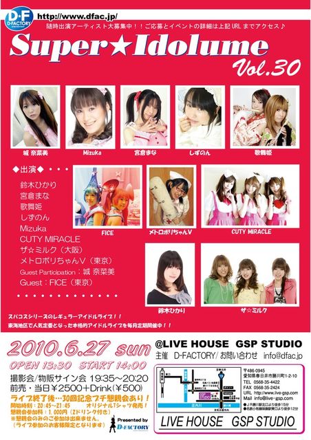 ¥¹¥Ñ¥³¥¹Present's ¡ØSuper¡ùIdolume vol.30¡Ù½Ë¡ª30²ó Æü»þ¡§2010.6.27(sun) ²ñ¾ì¡§GSP STUDIO(½ÕÆü°æ»Ô¾¡Àî) ½Ð±é¡§ ¡¦ÎëÌÚ¤Ò¤«¤ê ¡¦CUTY MIRACLE ¡¦¤·¤º¤Î¤ó ¡¦¥¶¡ù¥ß¥ë¥¯¡ÊÂçºå¡Ë ¡¦µÜÁÒ¤Þ¤Ê ¡¦¥á¥È¥í¥Ý¥ê¤Á¤ã¤ó£Ö¡ÊÅìµþ¡Ë ¡¦²ÎÉñɱ ¡¦Mizuka Guest Participation¡§¾ë ÆàºÚÈþ Guest¡§FICE ¢¨½Ð±é½ç̤Äê OPEN¡§13:30¡¡START¡§14:00¡Á »£±Æ¥µ¥¤¥ó²ñ¡¦ÊªÈΡ§19:35¡Á20:20 Á°Ç䡦ÅöÆü¡§\2,500+D(\500) ¡ù¥Á¥±¥Ã¥ÈͽÌó¤Ï³Æ½Ð±é¼Ô¤«¤é¤«¢¤Þ¤Ç http://www.dfac.jp/form.html º£²ó¡¢¥é¥¤¥Ö¸å¤Ë30²óµÇ°¤Î