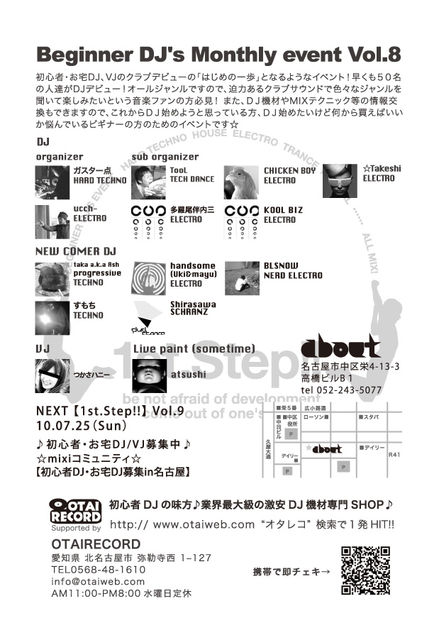 ºÇ¸å¤Ë¡¢2nd¡¡Step!!¤Î¾ÜºÙ¤¬¤¢¤ê¤Þ¤¹¤è¡Á ¡Ú1st Step¡ª¡ªVol.8¡Û supported¡¡by¡¡¥ª¥¿¥¤¥ì¥³¡¼¥É http://www.otaiweb.com Ʊ¤¸¤¯¥À¥ó¥¹¥ß¥å¡¼¥¸¥Ã¥¯¸ÂÄê¤Ç¤¹¤è¡Á ¥¨¥ó¥È¥ê¡¼³«»Ï¡ª¡ª ¤È¤ê¤¢¤¨¤ºº£²ó¤âÁᤤ¼Ô¾¡¤Á¤Ç¡Á¤¹¡Ê¾Ð¡Ë DJ¡¦VJ¤½¤ì¤¾¤ì¿Í¿ô¤¬½¸¤Þ¤ê¼¡ÂèÊ罸¤òÄùÀÚ¤Þ¤¹¡£ ¤½¤ì¤Ç¤Ï¡¢¥¤¥Ù¥ó¥È¤Î¾ÜºÙ¤Ç¤¹¡£ ¤¹¤ß¤Þ¤»¤ó¤¬¡¢ËÜʸ½ÏÆÉ¤Ç¤ª´ê¤¤¤·¤Þ¤¹ ¡ü¥³¥ó¥»¥×¥È ½é¿´¼Ô¡¦¤ªÂðDJ¤äVJ¤Î°Ù¤Î¥¤¥Ù¥ó¥È¡£ ¥¯¥é¥Ö¥Ç¥Ó¥å¡¼¤Î¤Ï¤¸¤á¤Î°ìÊâ¤Ê¤ëÍͤʥ¤¥Ù¥ó¥È¤Ç¤¹¡£ ¤Þ¤º¤Ï¡¢1st Step¡ª¡ª¤«¤é¥¹¥¿¡¼¥È¤·¤Þ¤·¤ç¤¦¡£ ¡ü