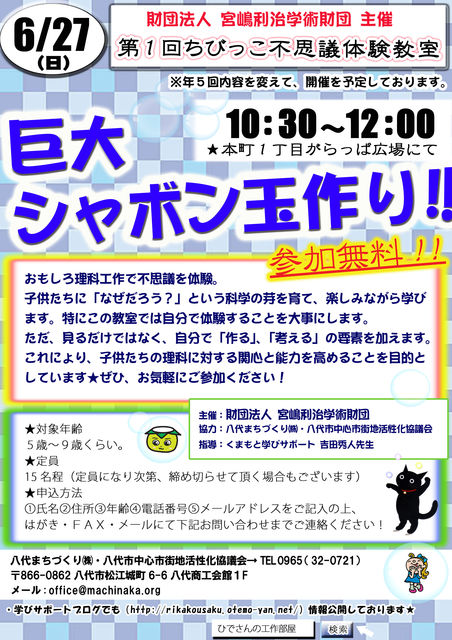 本町アーケードで、子供さん向けのイベントを開催いたします! 参加無料 お子さんの探究心や創造力を育むためのイベントです☆ ぜひご参加くださいませ!! -*-*-*-*-*-*-*-*-*-*-*-*-*-*-*-*-*-*- 6月27日(日)10:30-12:00 場所:本町アーケード がらっぱ広場 財団法人 宮嶋利治学術財団 主催 第1回ちびっこ不思議体験教室【巨大シャボン玉作り!】 ☆内容☆ ?子供さんが入れるくらいの大きな大きなシャボン玉を作る! ?自分で大きなシャボン玉を作るためのわっかを作成。 普段、おうちで作れ