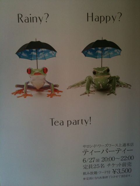 今月もやってまいりました!! ティーパーティー!! 今回は梅雨に乗っかって、ピッチピッチチャプチャプ 店に雨を降らして水浸しティーパーティー・・・ ってできるかい!! たくみです。 湿気が多くなって 気分的にもうっそうとしてくるこの時期 モヤモヤと五月病を引きずってませんか? そんなもん、雨と共に流してしまいましょう!! ということで、 来たる 6月27日(日) 20:00から22:00まで チケット代 3500円 定員25人 盛り上がる(はずの)ゲーム おいいしい紅茶とお酒 ミキティのご飯