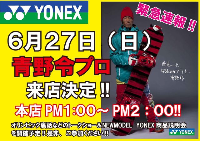 ☆オリンピック選手 青野令 来店 YONEX商品説明会☆ 皆さん、まだバンクーバーオリンピックの記憶にあると思います、 あのハーフパイプ種目でのオリンピック選手 「青野令」プロがモリスポへ来店ですっ!! オリンピックでの裏話から今シーズンのNEWMODEL YONEX商品情報まで いろいろな話が聞けちゃいますっ!! 特にYONEXアイテムの購入を考えていた方、この機会に是非!! 特別なノベリティ特典がGETできるかも!? 「YONEXといえば「カーボン素材」 そのカーボンに迫ってみましょう!!」 是非、ご参加くださいっ!!