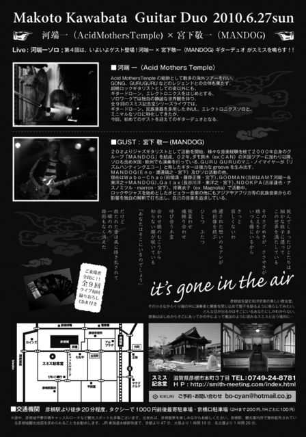 河端一×スミス記念堂シリーズライヴ。 「スミスで会いましょう」 第4回は、いよいよゲスト登場 河端一(AcidMothersTemple)×宮下敬一(MANDOG) ギターデュオ がスミスを鳴らす! 初めてお二人のデュオを聴いた瞬間に、 宮下さんをゲストに呼びたいと思っていました。 とても自然にお互いを引き出す、 繊細な魂の擦り合わせを感じます。 只今、絶賛欧州ツアー中の河端氏、 灰野敬二氏との共演もあり、 告知写真にはスミスの模様が使われています。 さて、次回のスミスではどんな演奏が聴けるのでしょうか。 6/27(