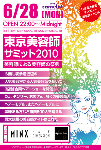 6月28日 毎月最終月曜日に渋谷のキャメロットで開催 日本最大規模の美容師ナイト 超人気店舗がヘアーショーを開催 美容師,アパレルの客層でにぎわうパーティーです 渋谷キャメロットにて毎回500人 お洒落ボーイ、お洒落ガール率NO.1イベントです 今回は 『HAIR DIMENTION』 『apish』 『MINX』 美容師なら誰もが一度は聞いたことがある有名サロンを揃えました この3サロンのヘアショーが見れる機会は、本当に滅多にないと思います も