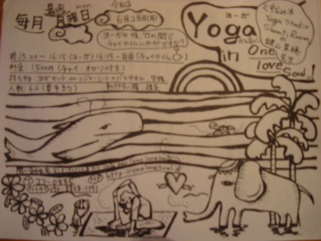 2010年 6月28日(月) Yoga in OneLoveSoul♪ 主宰 鍵山 菜穂 http://kusunamikiyogastudio.miyachan.cc 15:00〜16:15(ヨーガ) 16:15〜竹の間チャイタイム♪ fee \1500(OneLoveチャイ付き) (参加費の一部は、口蹄疫のチャリ