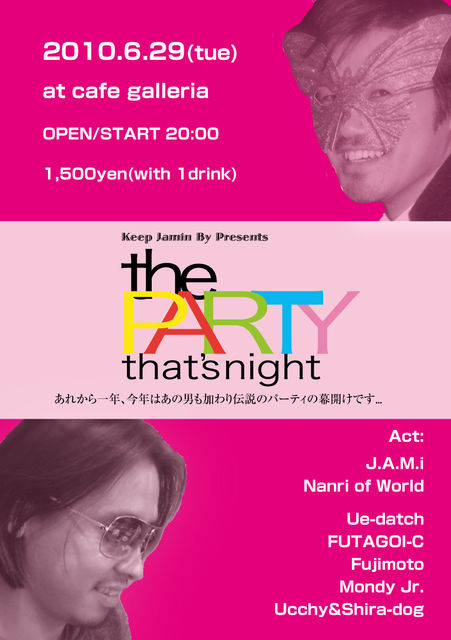 ■Title Keep Jamin By present's THE PARTY ■Date 6/29 (tue) OPEN/START 20:00 ■Place cafe galleria ■Tcket 1,500yen(with 1drink) 昨年6月、平日にも関わらず80人近く集めた伝説のパーティ"Keep Jamin By"… あれから1年、今年も調子に乗って開催決定!! 会場はなんとあのKeep Jazz Byの会場にもなった 大名の老舗ダイニングカフェ "cafe galleria" !! そしてなんと言っても今年は二つのKJBのキーパーソン "世界のNanri(Ma groove)"が復活!! この男の現れるところにはきっと何かが起こる
