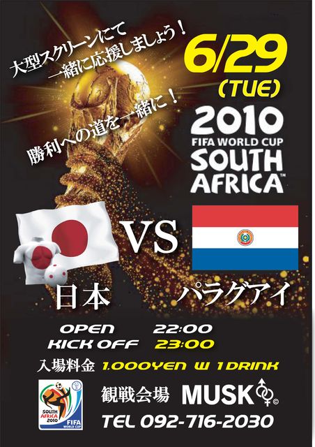 日本×パラグアイ戦 @MUSK 前回に引き続きMUSKで日本戦を応援したいとおもいます! 今回はもっと気合をいれて応援しましょう! 時間帯も良い時間帯なので、皆さんお待ちしております。 ★MUSKは予約無しで、入場できますのでお早めに御来店ください。