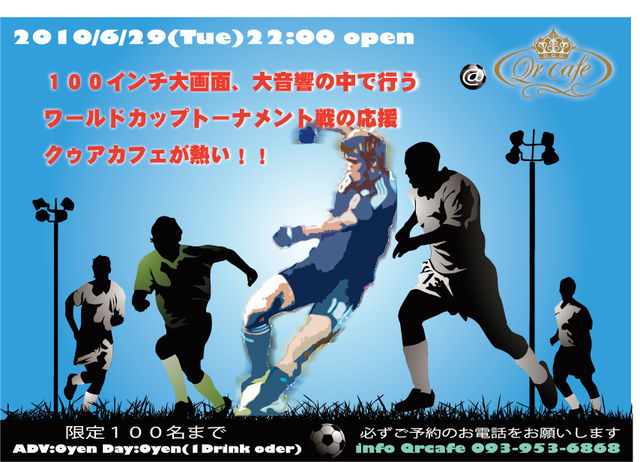 2010/6/29(Tue)22:00 open 100インチ大画面、大音響の中で行う ワールドカップトーナメント戦の応援 クゥアカフェが熱い!! 限定100名まで チケット代決勝トーナメント進出を祝して 無料!!(1Drinkだけオーダー) 先着予約順で良い席をご用意いたしますので、 電話で番号をもらったら覚えておいてください。 お問い合わせ0939536868 近くに格安有料駐車場あります、お電話で確認 地図は携帯HPよりご確認できます