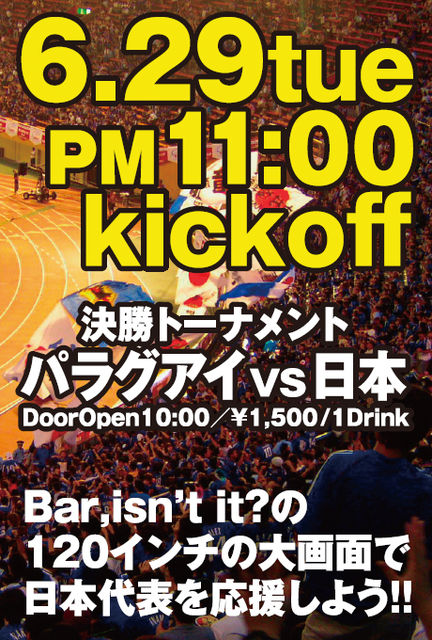 管理人様、告知失礼致します。 仙台 クラブイベント情報のコミュニティーの皆さん、トピックご覧いただきありがとうございます。 昨日は日本代表の試合盛り上がりましたね! 早速ですが、来たる6月29日、我らが日本代表の決勝トーナメント初戦、パラグアイ戦の日もイズントイットは営業致します!夜10時OPEN予定。 Men 1500yen 1 Drink Ladies 1500yen 1 Drink カメルーン戦、オランダ戦同様、120インチの超巨大スクリーン+20インチモニター×5台をご用意しております。座席多数、おつまみ各種も販売します!た
