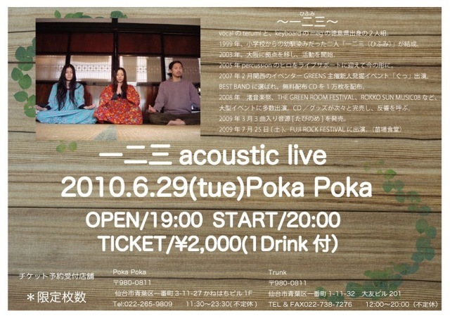 店ブログで告知していましたが、『一二三』初の東北ツアー。仙台はポカポカに来てもらえることになりました♪ 一二三HP http://www.hi-fu-mi.net/ 五月雨PV⇒http://www.youtube.com/watch?v=JxEmbluJUe8 一二三の音源 http://www.myspace.com/hifumispace こちらで視聴できます。 予約受付中です!mixi内でのご予約は私まで、「お名前、連絡先、枚数」をメッセージにてお送りください! または PokaPoka 〒980-0811 仙台市青葉区一番町3-11-27かねはちビル1F Tel&Fax/022-265-9809 までよろしくお願いします